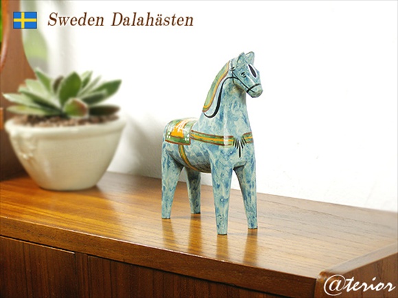 アンティーク調ペイントにより、18世紀前半のダーラナホースが再現されています。 ボディ全体はブルー、模様にグリーン・オレンジ・ブラック・ホワイト・ワインレッドの5色が使われ芸術的な色彩です。 仕上げはブルーの同系色の重ね塗りにより時の流れが感じられるような、アンティーク独特な質感が表現されているのが特徴です。 目を中心に温かみのあるやさしい顔立ちも印象的。 とても美しい色のバランス、趣のあるアンティーク調ペインティングをお楽しみください。 シリアン湖畔に位置するメーカーさんのもので、個性的な色彩センスを生かした魅力的なダーラナホースが作られています。 ダーラナ地方では有名なデザインの一つで、ブランケットのデザイン画に起用されたこともあり、高い評価を得ているダーラナホースです。数が少ないため日本で見かけることは少ないと思います。 ダーラナホースをコレクションされている方に特にお勧めです。