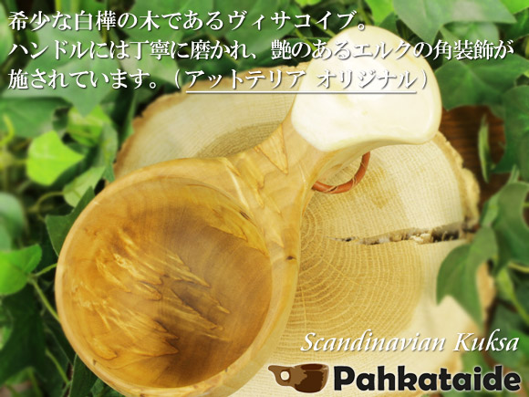 突然変異でのみ生まれる素材のため数が少なく、ククサの材料として用いられるものは希少です。 そのため、フィンランドでは、ヴィサコイブ製ククサは、とても大切な存在とされています。 |