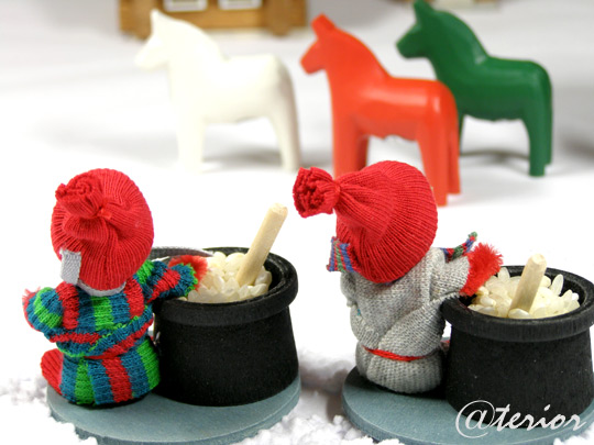 スウェーデンではクリスマスの時期にトムテのために家の外の雪の上にミルク粥を出す習慣があります。トムテの服の色は"グレー"と"3色ストライプ"の2タイプ。